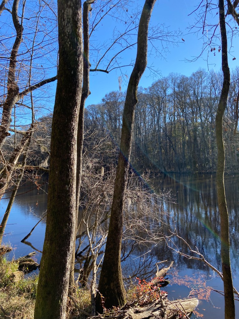 As it winds around the floodplain, some areas of the forest remain flooded.