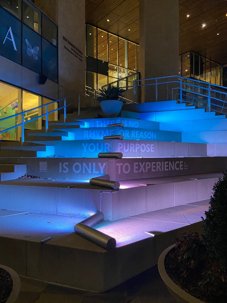 “There’s no rhyme or reason, your purpose is only to experience,” the steps leading to the Mint Art Museum say.
