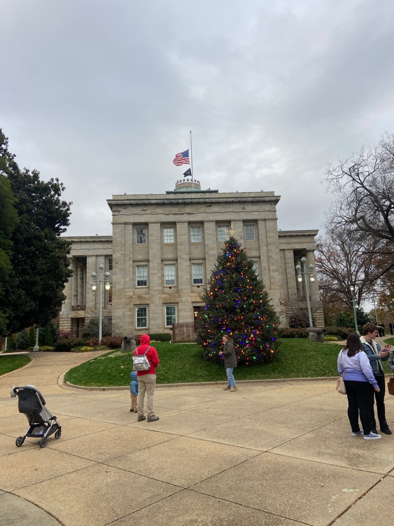 On the way back to the car, I walked past the capitol building. It also was pretty busy! Last time I was in Raleigh, I remembered it being a ghost town. This was definitely a nice change. They even had a cute little Christmas tree out front.