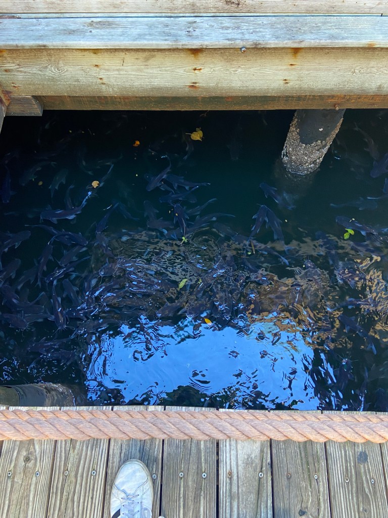 By the entrance these fish were feasting on dropped crumbs.