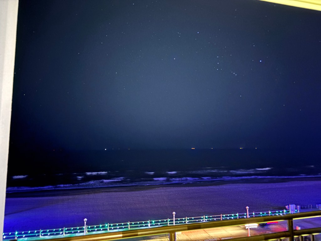 We swung by the room to layer up and I grabbed a photo of the dark ocean with stars on the horizon.
